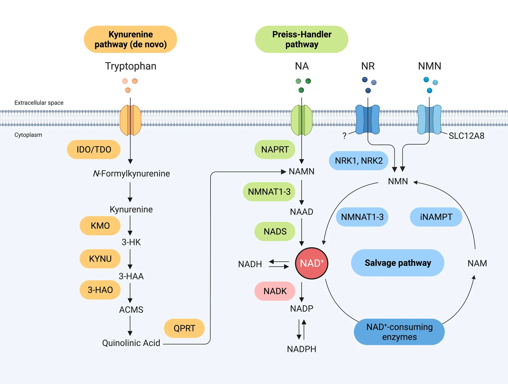 Как уже упоминалось, никотинамидмононуклеотид (NMN) является предшественником NAD⁺. Чтобы понять, как NMN превращается в NAD⁺, необходимо разобраться во всех путях, с помощью которых организм способен синтезировать эту молекулу. Для этого исследуются биосинтетические пути образования NAD⁺, представленные на схеме ниже.