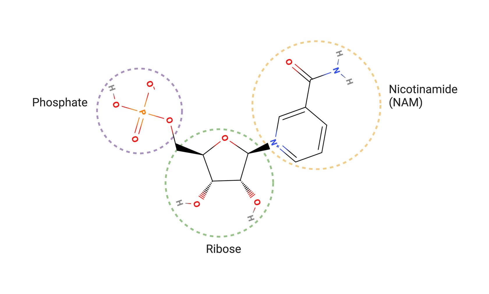 Молекула NMN представляет собой нуклеотид, состоящий из азотистого основания (никотинамид), сахара (рибоза) и фосфатной группы. Нуклеотиды вам могут быть знакомы как строительные блоки ДНК и РНК, однако они также выполняют функции кофакторов в клеточной сигнализации и метаболизме. АТФ — энергетическая валюта клетки — тоже является нуклеотидом. Различие в функциях нуклеотидов определяется прежде всего типом азотистого основания.
